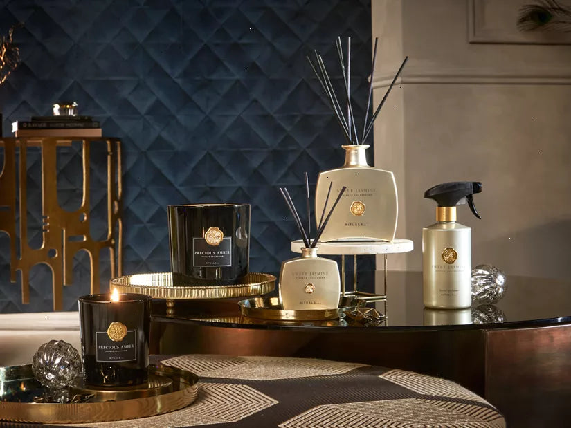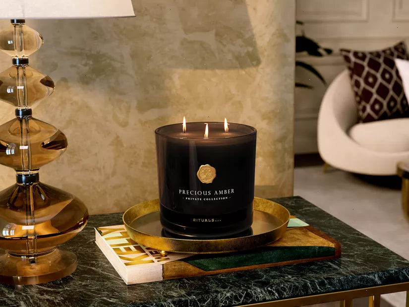 Transform your home into a sanctuary with the luxurious Precious Amber scented candle. This scented candle is a real eye-catcher for the home and provides an explosion of fragrance into larger rooms such as the living room or a big hallway. The sleek black glass jar features a metallic, semi-transparent finish, allowing you to observe the gentle flicker of the candles within. With an aromatic opening of juniper and fresh cardamom fragrance, it has a spicy heart mingled with opulent ylang ylang, followed by the addition of patchouli, vetiver, and rich amber notes. This is a fragrance that you and your loved ones can enjoy for up to 70 hours. Order now from the official webshop.