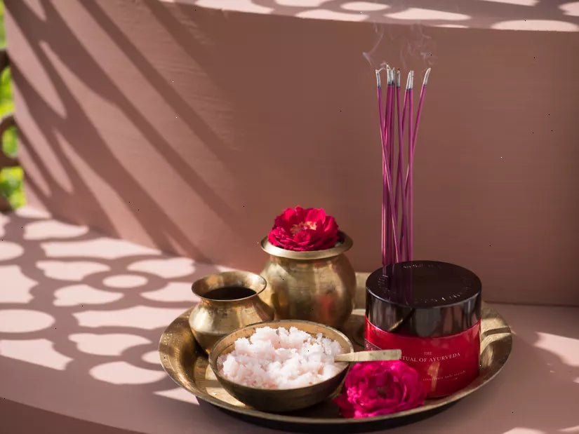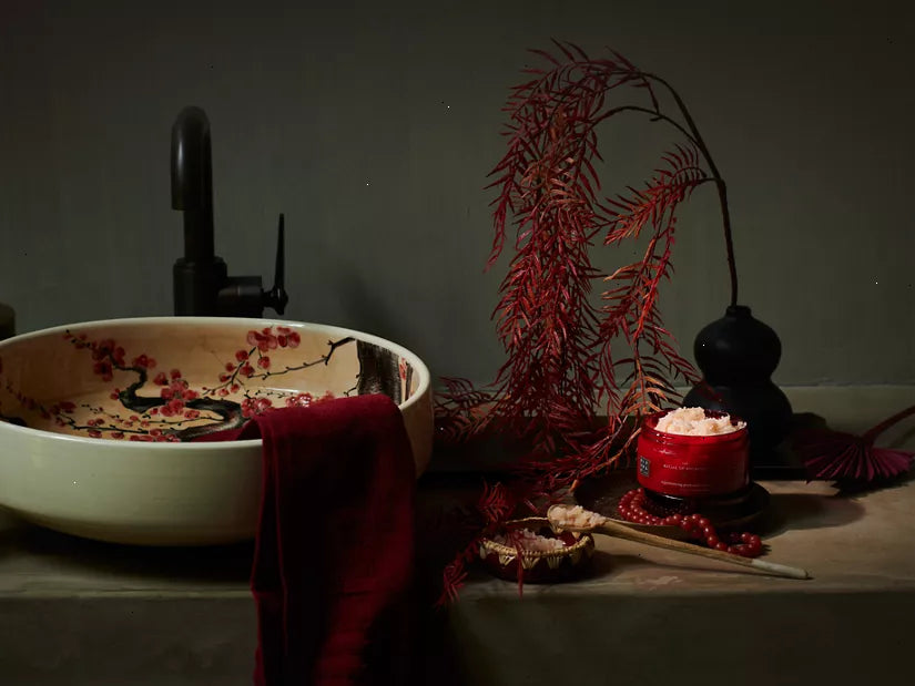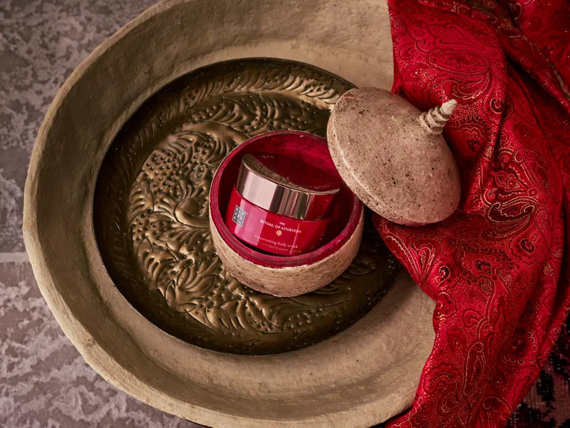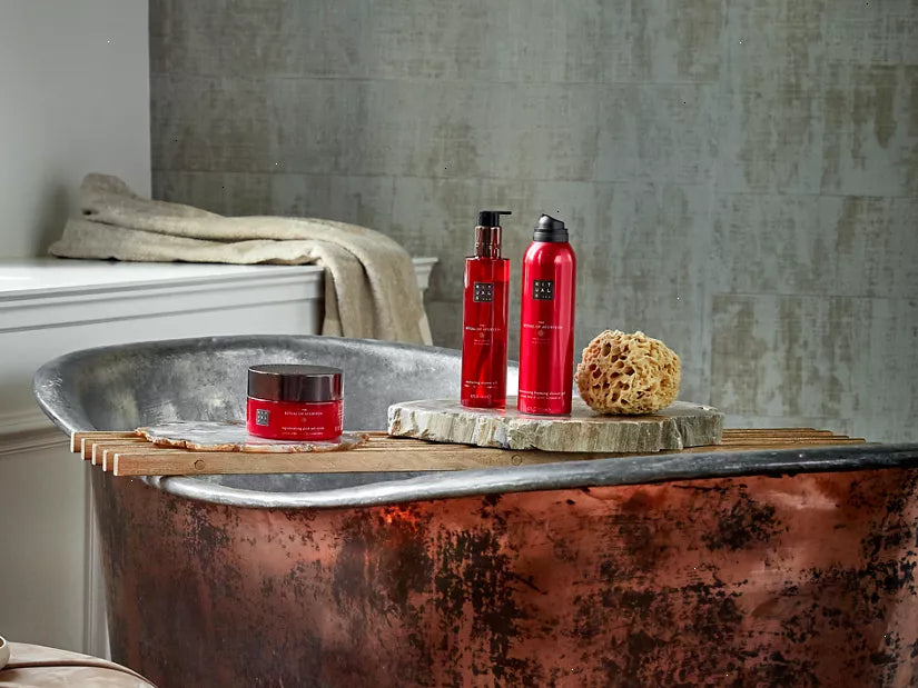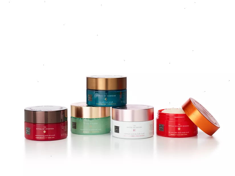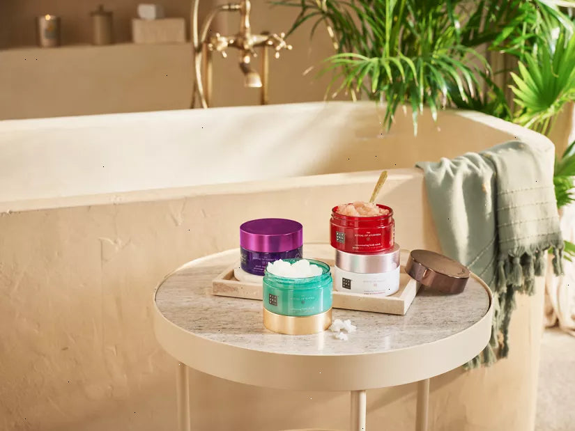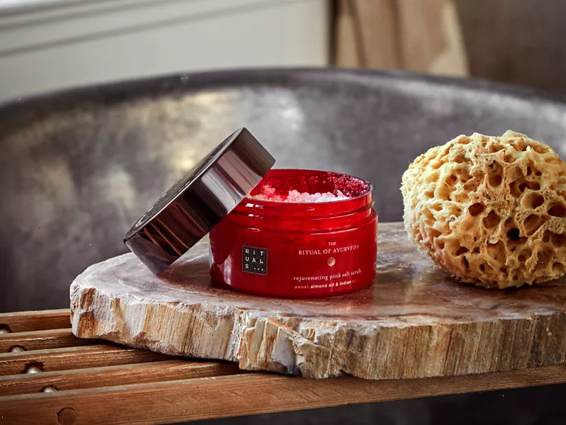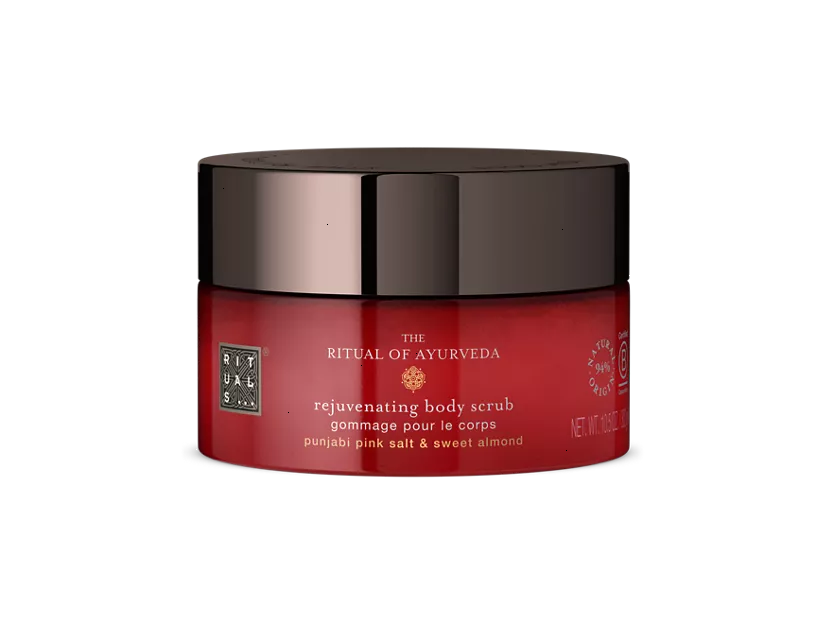 A rejuvenating 94% natural origin body scrub that contains a carefully formulated base blend of rich oils and pink salt, which has a purifying and rejuvenating effect on your skin. The potent sweet almond shell particles help to buff away dead skin cells for a softer, nourished and smoother feeling. The scrub also leaves an ultra-nourishing, thin layer of rich Ayurvedic oils behind with sweet almond and coconut oil – rich in vitamin E – to protect the skin, and moringa oil to promote a natural healthy glow. According to traditional Ayurvedic science, scrubbing is a highly effective way of purifying your body and stimulating energy flow. This process is enhanced when taking a warm bath with The Ritual of Ayurveda bath foam.