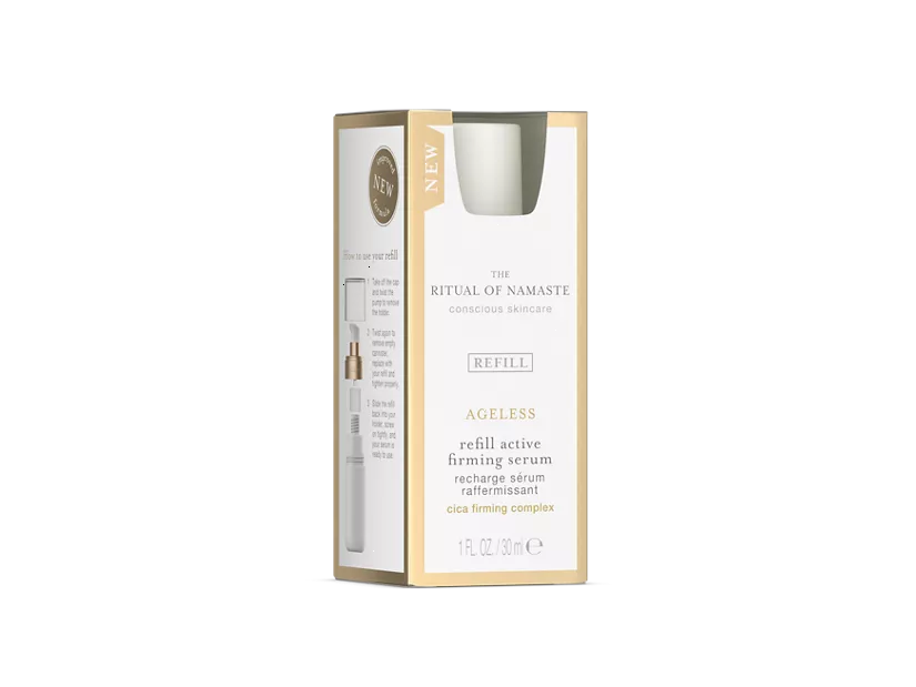 Show respect for your skin and respect for nature with this eco-chic refill for your ageless firming serum. It fits perfectly in your luxurious bottle and contains the same skin firming and lifting formulas. The CICA Firming Complex' natural ingredients CICA and rock rose combine to create this active firming serum from The Ritual of Namaste. Its silky soft finish helps to reinforce your skin's firmness and elasticity and visibly minimise the presence of fine lines and expression lines. The result is a stunning complexion with a radiant, ageless look – the best way to honour your natural beauty.