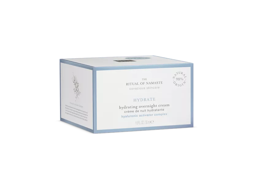 Give your skin the rest and replenishment it needs with the help of our Hyaluronic Activator Complex, and restore your skin while you sleep. This overnight cream from the Hydrate line of The Ritual of Namaste features an active compound with hyaluronic acid and ashwagandha to replenish the skin's moisture balance and protect skin cells from screen emitted blue light and environmental stress.