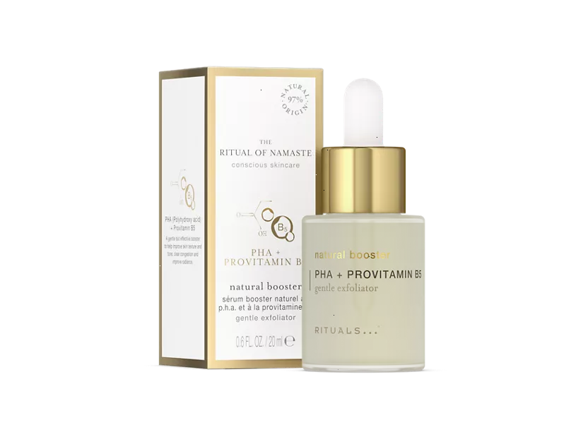 Discover the transformative power of our gentle yet highly effective skin-perfecting booster with 97% natural origin ingredients. The PHA + Provitamin B5 Natural Booster helps to fight the appearance of pores but also combats dullness and dry skin, leaving your complexion smoother and more refined. Provitamin B5 effectively retains moisture, fortifies the skin's barrier, and shields against irritation, ensuring optimal hydration and enhanced softness. This booster also contains the mild exfoliating power of PHA (Polyhydroxy Acid), a secret weapon for skin renewal and improved radiance. Order now from the official webshop.